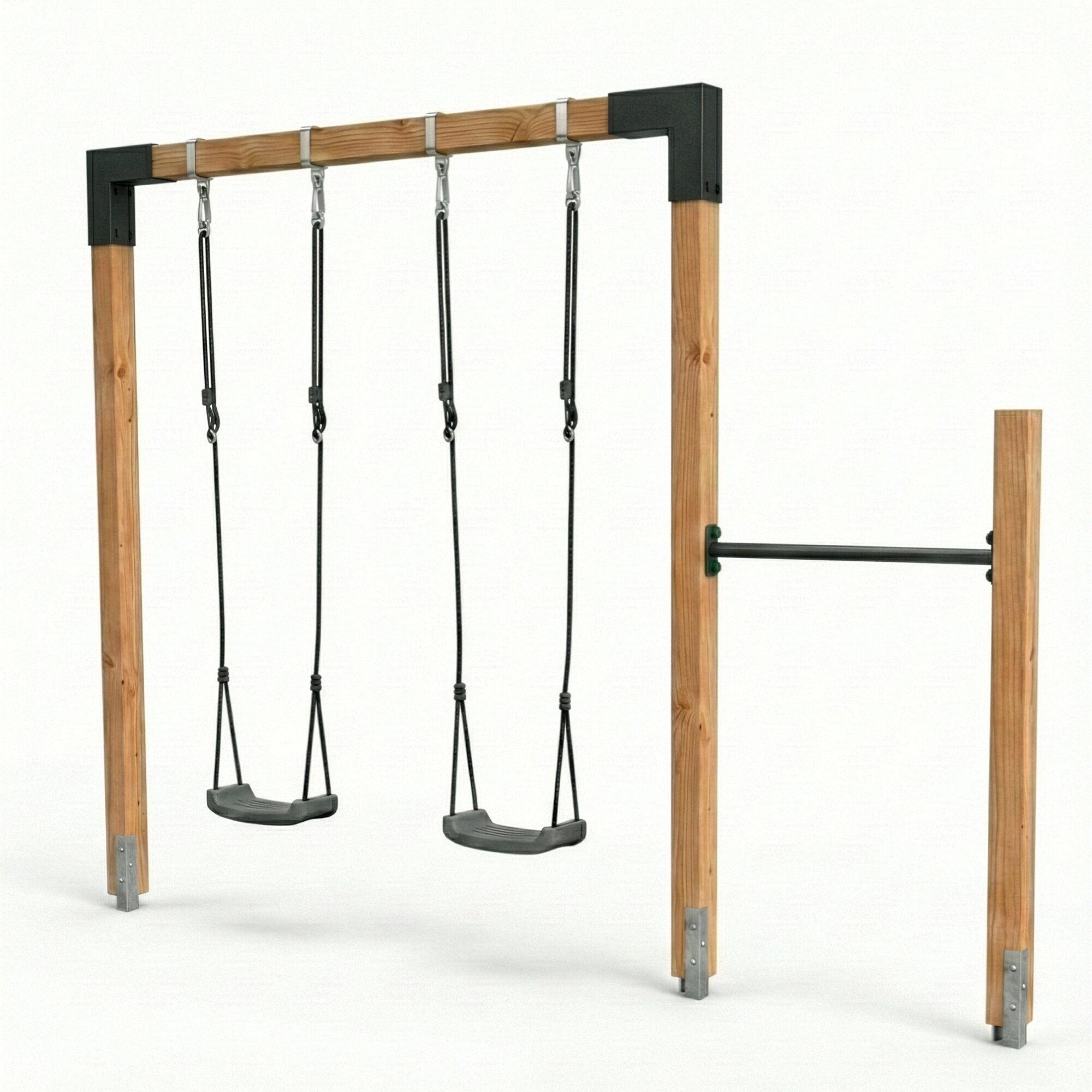 Extra stabilní a bezstarostné houpání. Houpačka se snadno montuje. Ocelové spojky s černě natřenými šrouby odolnými proti korozi zajišťují pevné spojení. Dřevěné nosníky o rozměrech 8,5 x 8,5 cm zajišťují stabilitu a krásný, robustní vzhled. Pro větší stabilitu zajistěte houpačku 80 cm dlouhými pozinkovanými zemními kotvami – dvěma na sloupek. Chytrá část: díky zemním kotvám se dřevěný rám vznáší těsně nad zemí a zabraňuje tak vniknutí vlhkosti do dřeva. Menší riziko hniloby dřeva, více let zábavy z houpání!
